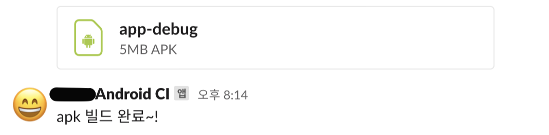 $ curl https://slack.com/api/files.upload -F token={Slack Bot 앱 만들 때 만들어진 토큰} -F channels={슬랙 채널 이름} -F file=@app/build/outputs/apk/debug/app-debug.apk