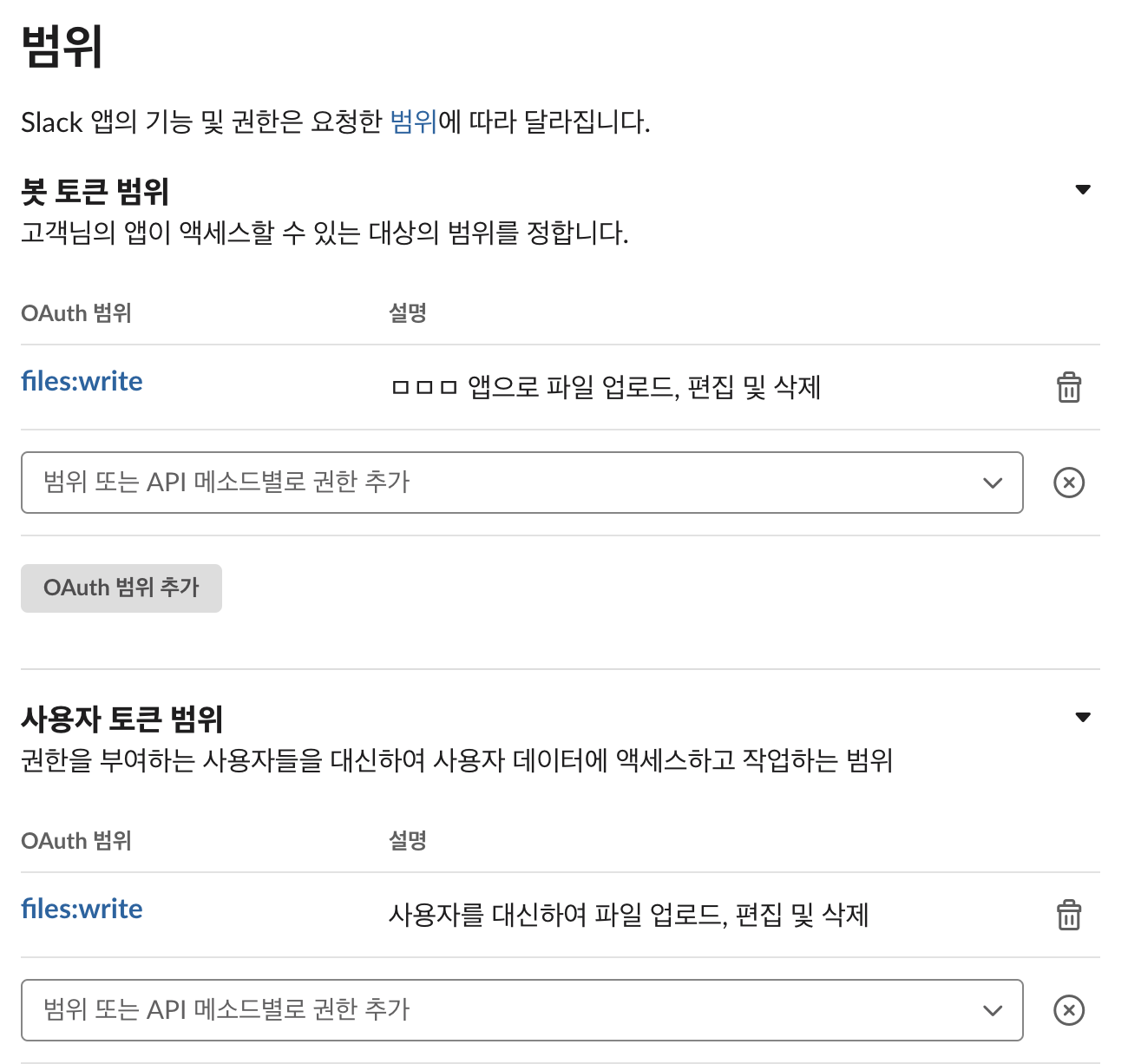 '범위'에서 files:write 권한 부여 (봇과 사용자 둘 다 필요)