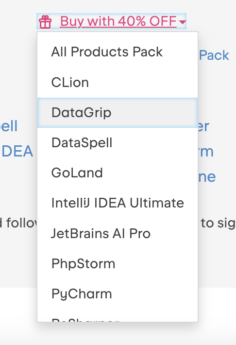 졸업 할인 40%는 단일 JetBrains IDE 구독이나 All Products Pack 개인 구독에만 적용된다.