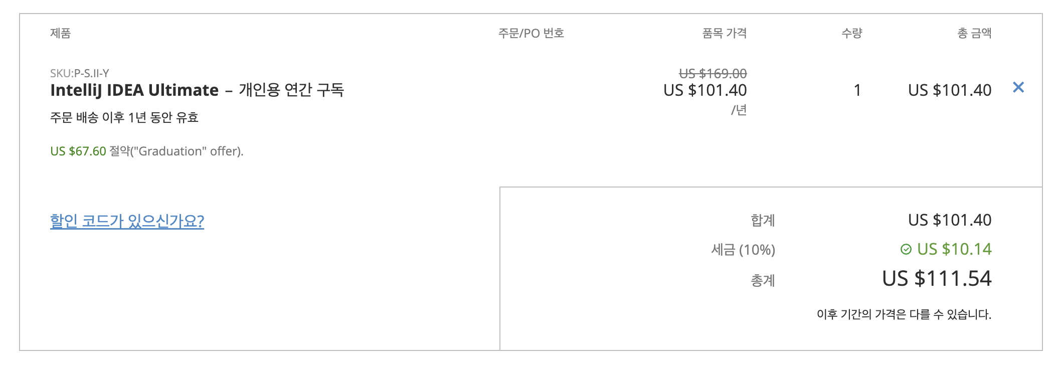 나는 All Pack까진 필요 없어서 Intellij만 단독으로 구독했다. 가격은 세금 포함 111.54달러, 이 글을 쓰는 오늘 기준 환율은 1,289원이니 14만원 대에 연간 구독을 할 수 있다. 2년차에는 20%, 3년차에는 40% 추가 할인을 받는다.