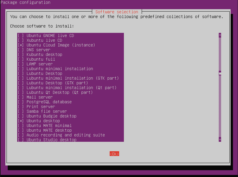 화살표로 상하 이동이 가능하고, 스페이스바로 Ubuntu desktop을 선택해주자. tab으로 ok 버튼으로 이동하고 enter를 누르면 설치가 진행된다. (꽤 오래걸린다)