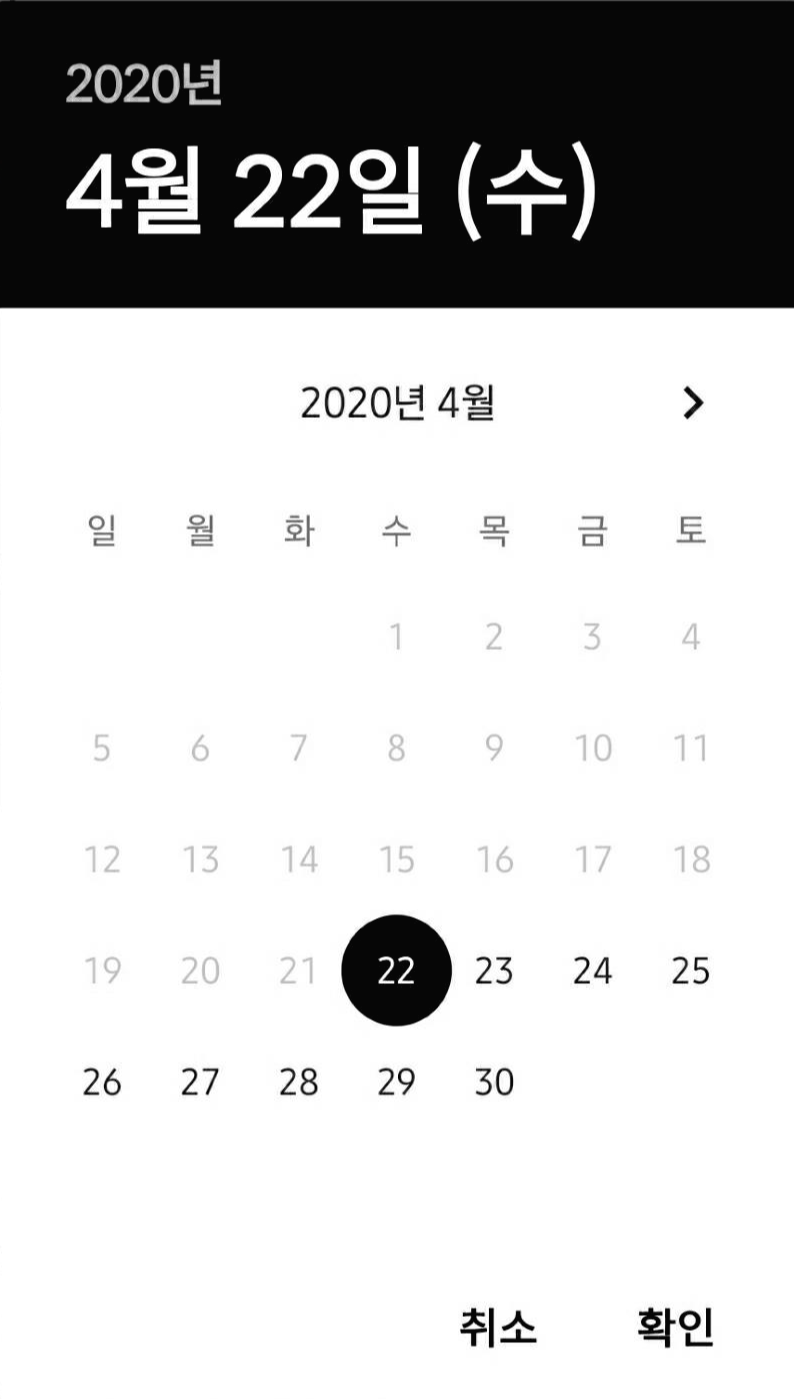 이미 지나간 날짜는 선택할 수 없다던가, 오늘 기준으로 1개월 이내의 날짜만 선택가능하게 한다던가... 사용자가 선택할 수 있는 날짜에 범위가 필요한 경우가 있다. '확인'버튼을 눌렀을 때 현재 선택된 날짜를 검사해서 선택이 불가능하다고 안내 메세지를 보여주는 방식으로도 처리할 수 있지만, DatePicker 자체에서 아예 선택을 막을 수 있게 minDate, maxDate 속성을 제공한다. xml에서 설정할수도 있고, 코드로 설정할 수도 있다.