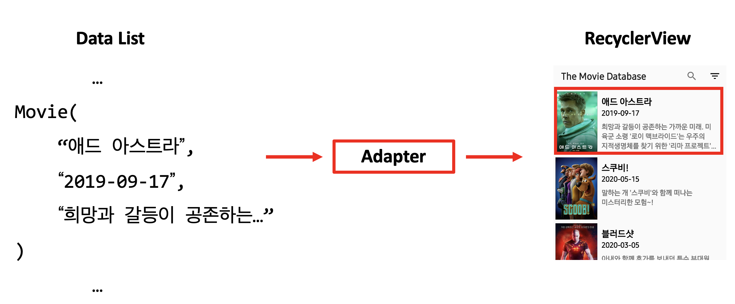 안드로이드에서 동일한 레이아웃을 반복적으로 뿌려주는 리스트형 UI를 만들기 위해 RecyclerView가 사용된다. RecyclerView를 사용하려면 Adapter, LayoutManager, ViewHolder 이렇게 세가지 준비물이 필요하다. 그 중에서 Adapter는 데이터 리스트를 실제 눈으로 볼 수 있게 itemView로 변환하는 중간다리 역할을 한다.